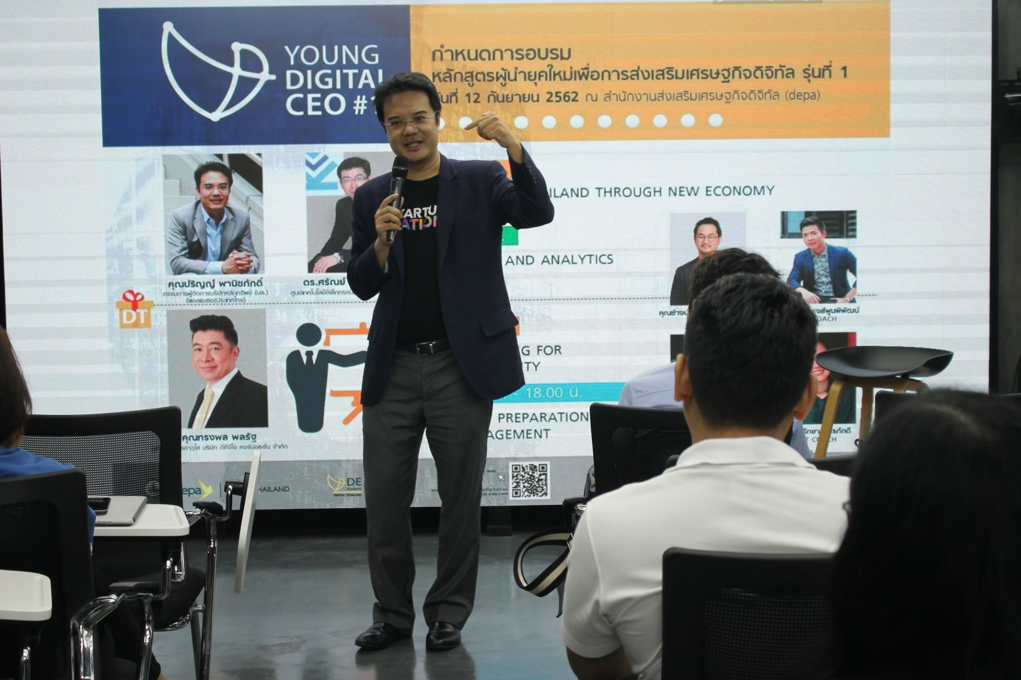 Digital Economy Promotion Agency has been organized the Young Digital CEO (1st generation) course with emphasis on the essence in 4 aspects 1) Digital for Economy : DE 2) Digital for Society : DS 3) Digital for Manpower : DM 4) Digital for Transformation : DT by using participatory learning and sharing experiences between learners and expert mentors. In addition, there are 4 learning activities 1) Visiting digital organizations and cutting-edge technology in the country 2) Visiting digital organizations and cutting-edge technology abroad 3) Learning Activities in 4 subgroups (DE,DS,DM.DT) To summarize lessons, achievements and suggestions for create a academic work. and 4) An activity for a new generation to promote the digital economy for building cooperation between individuals and organizations.