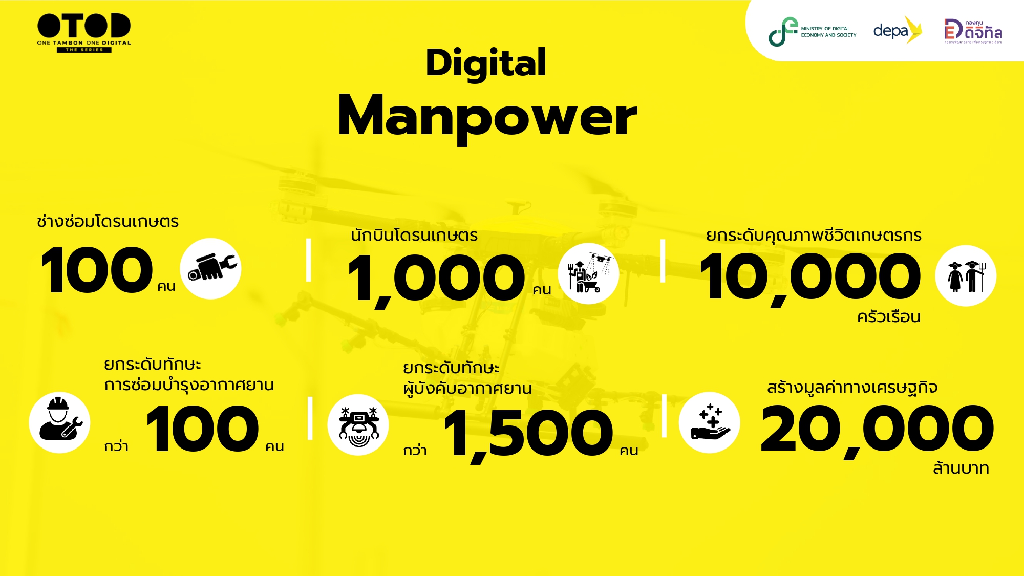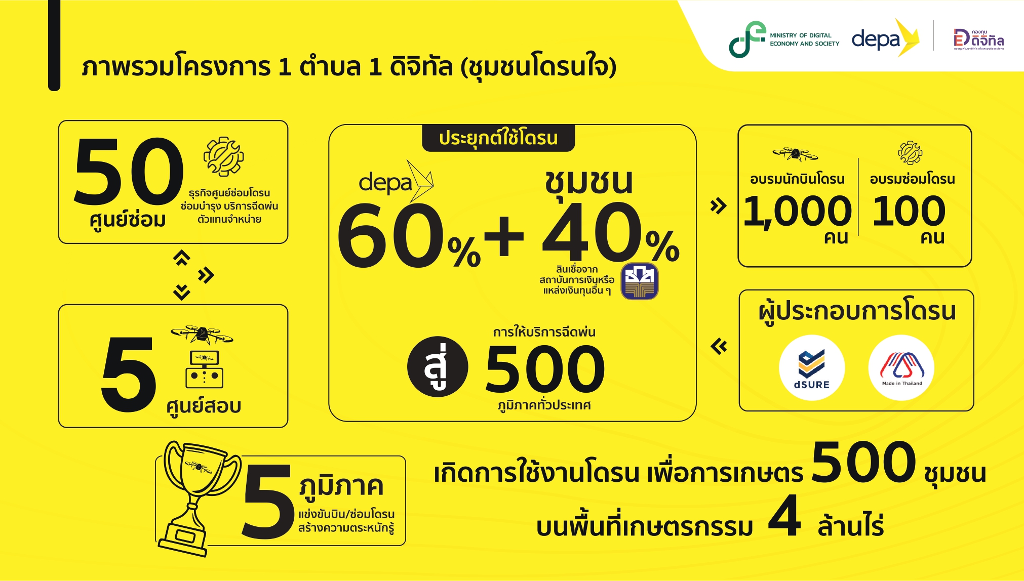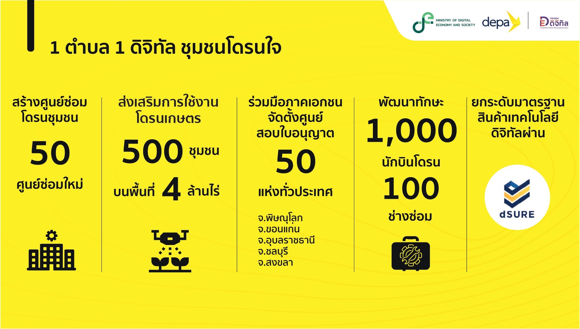 โครงการ 1 ตำบล 1 ดิจิทัล (ชุมชนโดรนใจ) โดยมีวัตถุประสงค์เพื่อส่งเสริมและสนับสนุนให้เกษตรกรและกลุ่มชุมชนมีการประยุกต์ใช้เทคโนโลยีโดรนเพื่อการเกษตร 500 ชุมชนทั่วประเทศ ควบคู่กับการยกระดับธุรกิจซ่อมบำรุงเดิมไปสู่ธุรกิจซ่อมบำรุงและดูแลรักษาโดรนเพื่อการเกษตร จำนวน 50 ศูนย์บริการ พร้อมทั้งส่งเสริมและสนับสนุนการพัฒนาทักษะให้เกิดผู้ให้บริการบินโดรน จำนวน 1,000 ราย สร้างงาน สร้างอาชีพใหม่แก่ช่างซ่อมโดรนชุมชน จำนวน 100 ราย รวมถึงการเชิดชูเกียรติเกษตรกร หรือบุคคล ที่ประสบความสำเร็จในการใช้งานเทคโนโลยีโดรนเพื่อการเกษตรและการประกอบอาชีพด้านการให้บริการโดรนเพื่อการเกษตร