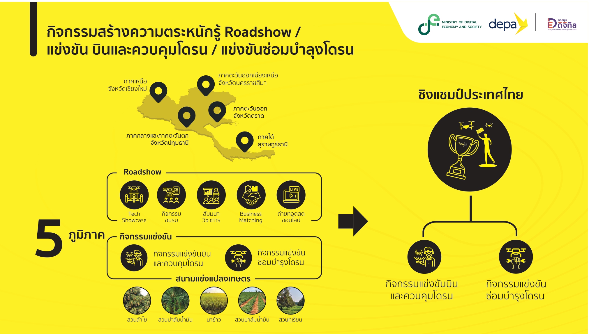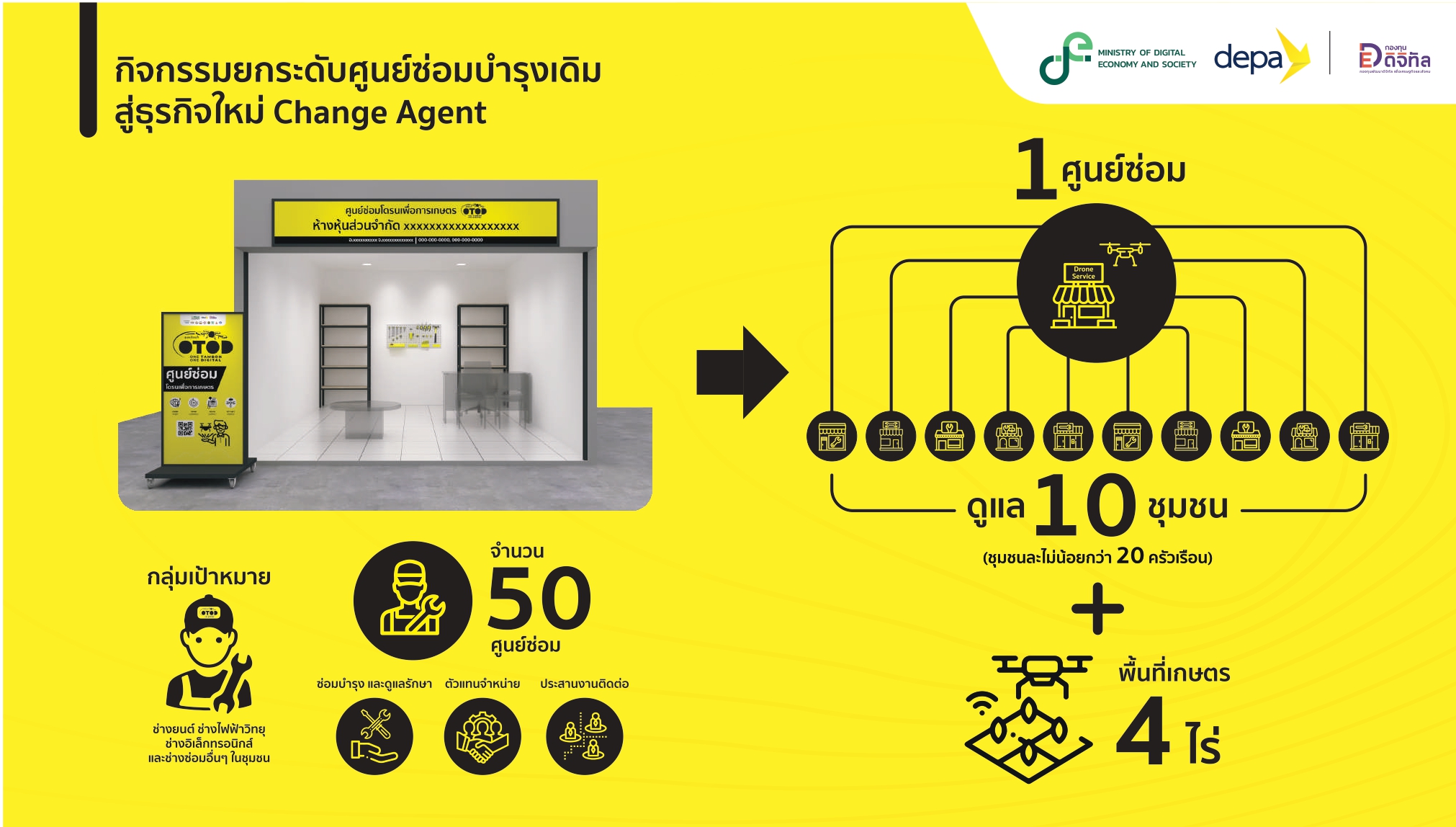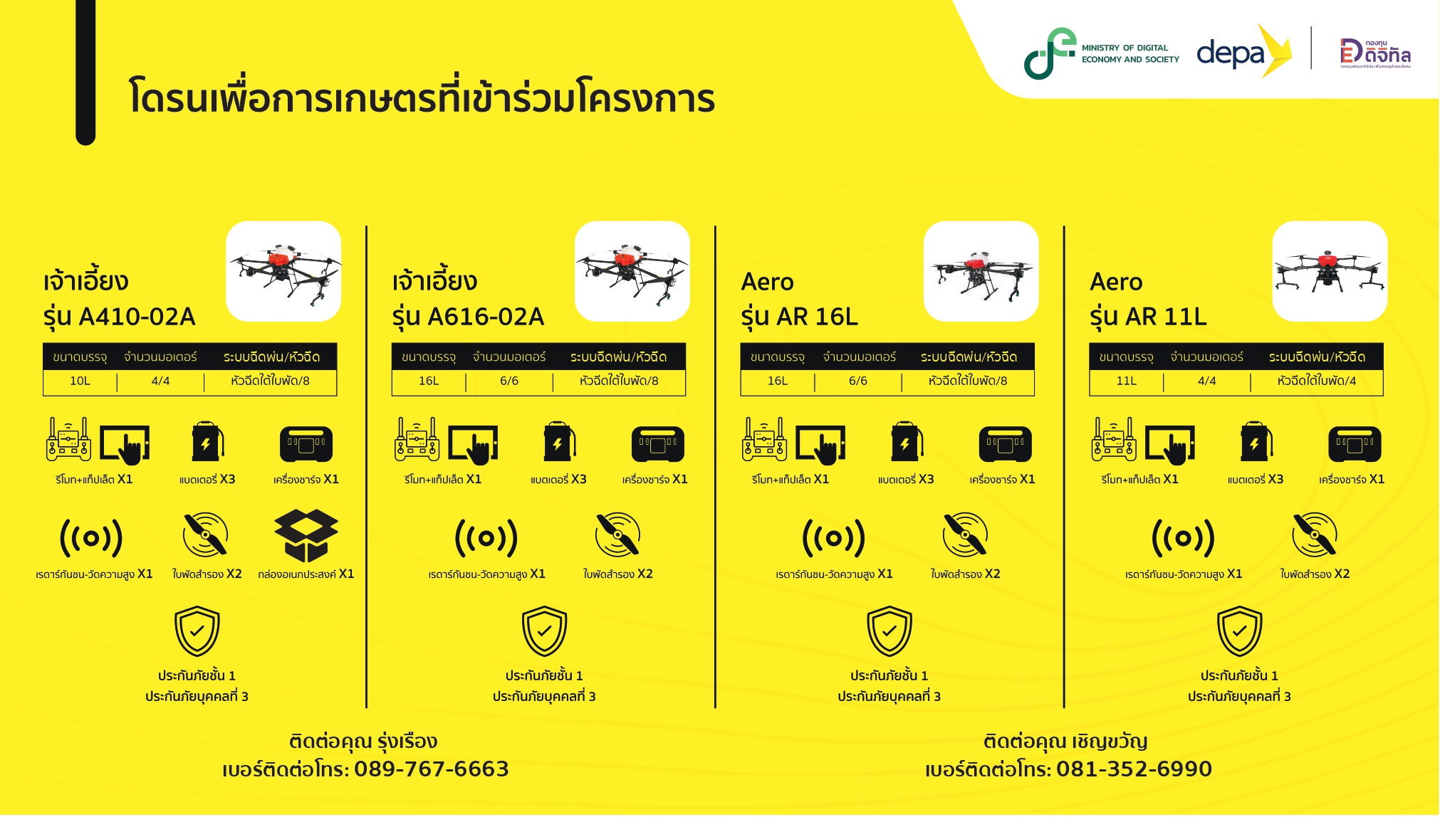 โครงการ 1 ตำบล 1 ดิจิทัล (ชุมชนโดรนใจ) โดยมีวัตถุประสงค์เพื่อส่งเสริมและสนับสนุนให้เกษตรกรและกลุ่มชุมชนมีการประยุกต์ใช้เทคโนโลยีโดรนเพื่อการเกษตร 500 ชุมชนทั่วประเทศ ควบคู่กับการยกระดับธุรกิจซ่อมบำรุงเดิมไปสู่ธุรกิจซ่อมบำรุงและดูแลรักษาโดรนเพื่อการเกษตร จำนวน 50 ศูนย์บริการ พร้อมทั้งส่งเสริมและสนับสนุนการพัฒนาทักษะให้เกิดผู้ให้บริการบินโดรน จำนวน 1,000 ราย สร้างงาน สร้างอาชีพใหม่แก่ช่างซ่อมโดรนชุมชน จำนวน 100 ราย รวมถึงการเชิดชูเกียรติเกษตรกร หรือบุคคล ที่ประสบความสำเร็จในการใช้งานเทคโนโลยีโดรนเพื่อการเกษตรและการประกอบอาชีพด้านการให้บริการโดรนเพื่อการเกษตร