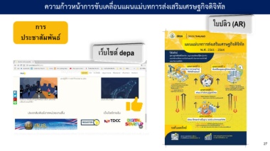 ความกาวหนาการขับเคลื่อนแผนแมบทการสงเสริมเศรษฐกิจดิจิทัล การ ประชาสัมพันธ์ http://www.depa.or.th/sites/default/files/publication/files/19-06-18%20DEPA%20PLAN%20BOOK%20V.6.5-draft_0.pdf 27