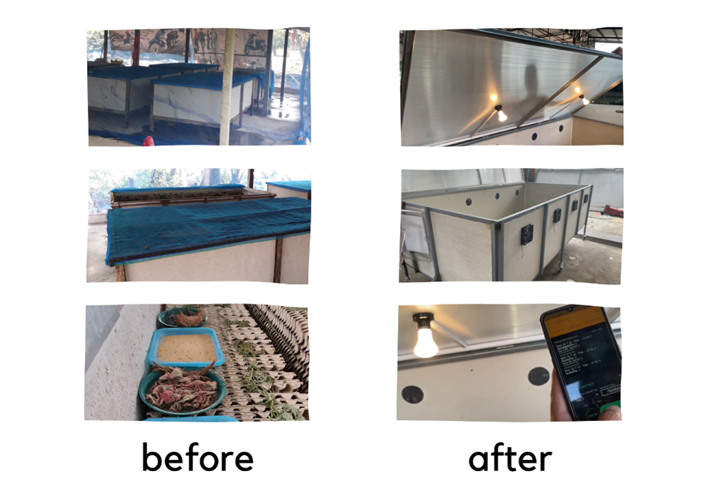 ภาพที่ 8 ภาพ before/after “โรงเลี้ยงจิ้งหรีดอัจฉริยะ พร้อมระบบควบคุมการเลี้ยง” โครงการพัฒนาศักยภาพการผลิตจิ้งหรีดด้วยเทคโนโลยี โดย วิสาหกิจชุมชนแปรรูป (2019) น้ำเพียงดิน ตำบลโบสถ์ (ที่มา: https://www.drive.google.com/file/d/1vRkZBhz7nkXB0jjmIsfSEZPC93qVEKkX/view?usp=sharing)
