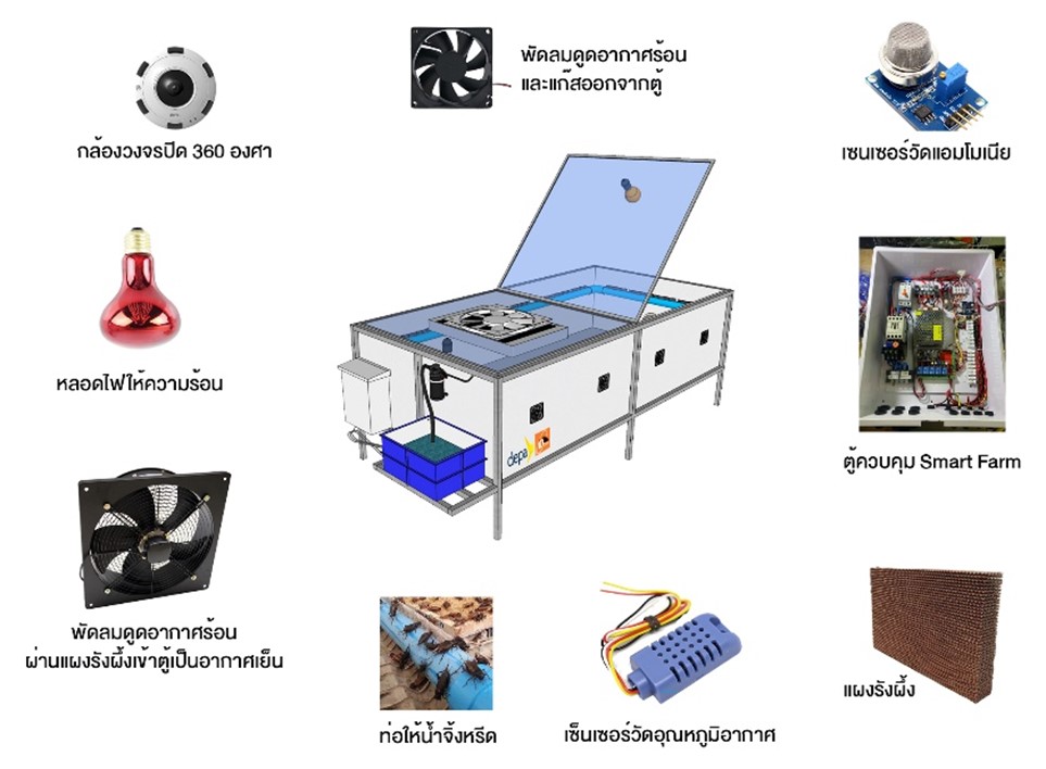 ภาพที่ 7 ภาพกราฟิกองค์ประกอบ “โรงเลี้ยงจิ้งหรีดอัจฉริยะ พร้อมระบบควบคุมการเลี้ยง” โครงการพัฒนาศักยภาพการผลิตจิ้งหรีดด้วยเทคโนโลยี โดย วิสาหกิจชุมชนแปรรูป (2019) น้ำเพียงดิน ตำบลโบสถ์ (ที่มา: https://www.drive.google.com/file/d/1vRkZBhz7nkXB0jjmIsfSEZPC93qVEKkX/view?usp=sharing)