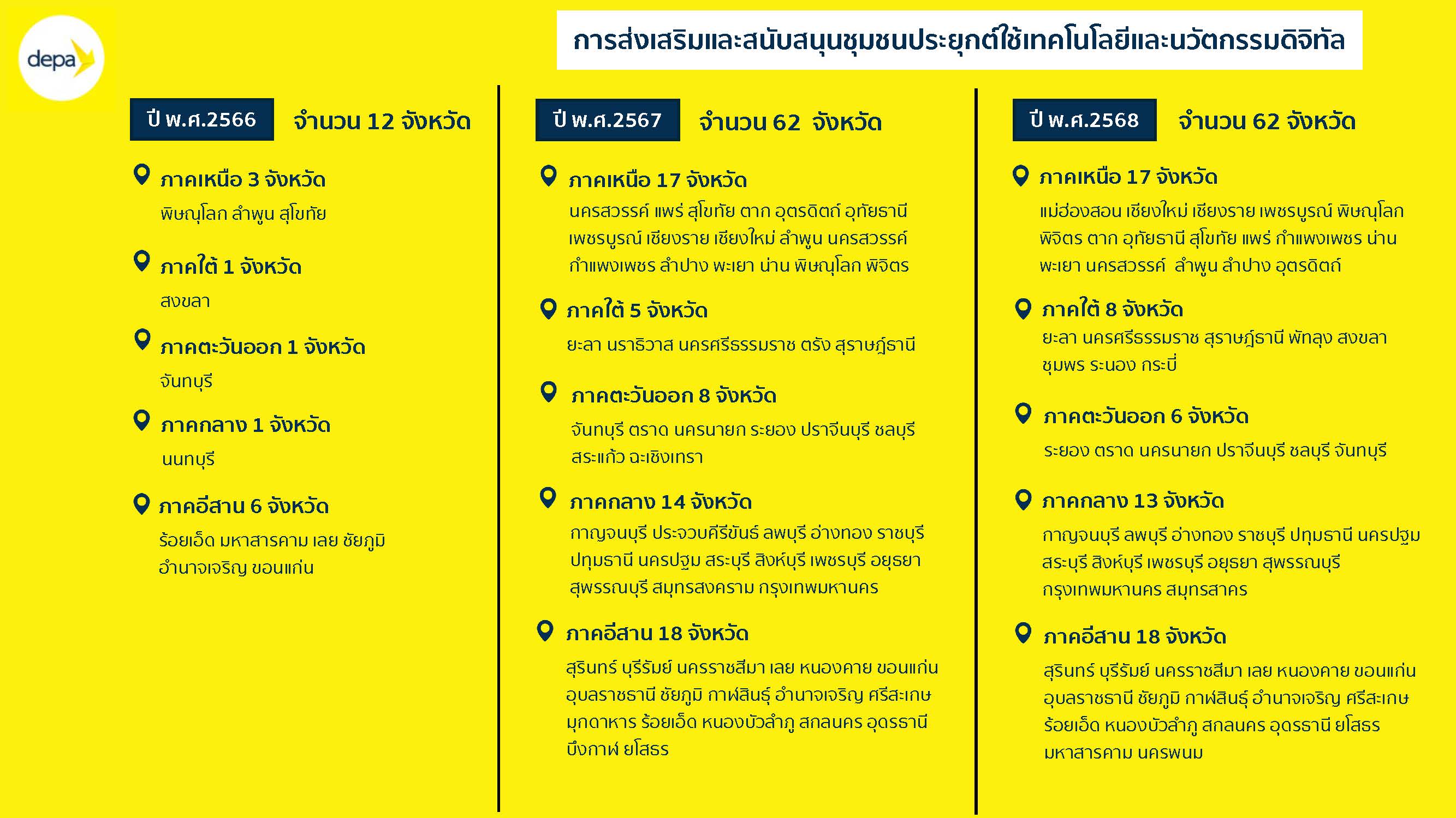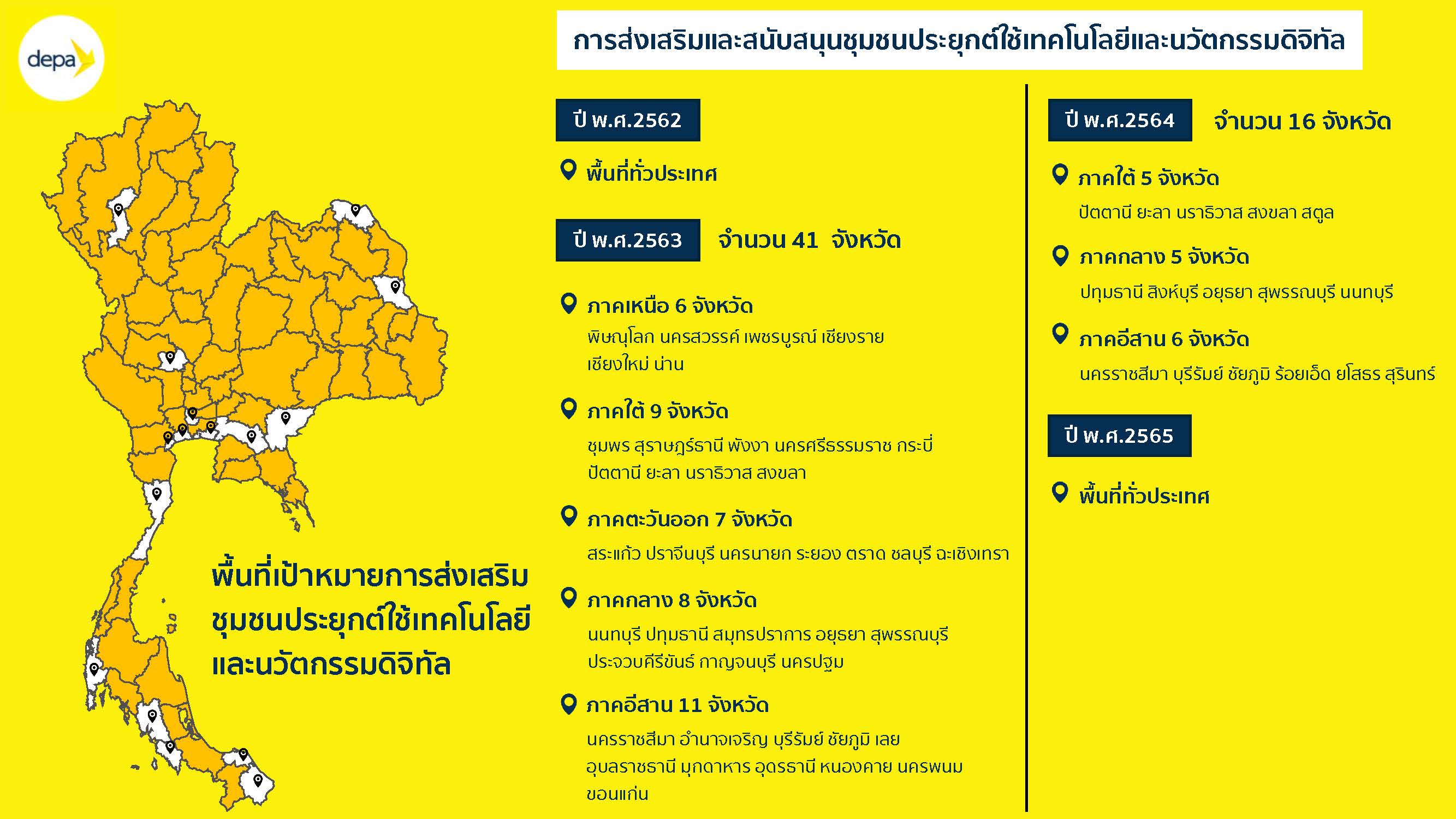 "เป้าหมายและพื้นที่โครงการส่งเสริมและสนับสนุนการประยุกต์ใช้เทคโนโลยีและนวัตกรรมดิจิทัลในชุมชนด้วยเทคโนโลยีและนวัตกรรมดิจิทัล เป็นโครงการมุ่งเน้นให้เกิดการต่อยอดภูมิปัญญาท้องถิ่นด้วยการประยุกต์เทคโนโลยีและนวัตกรรมดิจิทัล เพื่อการยกระดับคุณภาพชีวิตของชุมชน หรือการประยุกต์ใช้เทคโนโลยีเพื่อการเพิ่มขีดความสามารถ และรายได้ของชุมชนตลอดห่วงโซ่อุปทานให้ชุมชนมีความเข้มแข็ง มั่นคง และพัฒนาอย่างยั่งยืนผ่านมาตรการช่วยการประยุกต์ใช้เทคโนโลยีและนวัตกรรมดิจิทัลเพื่อชุมชนในชนบท (depa Digital Transformation Fund for Community) "