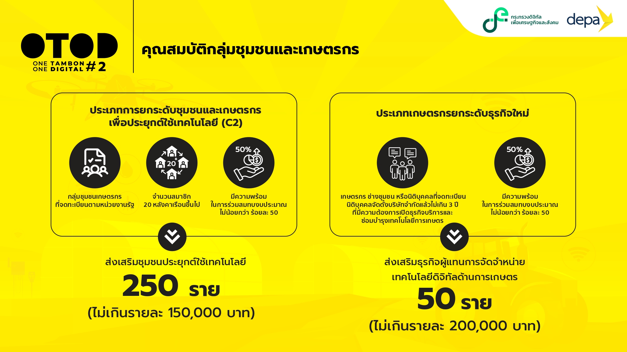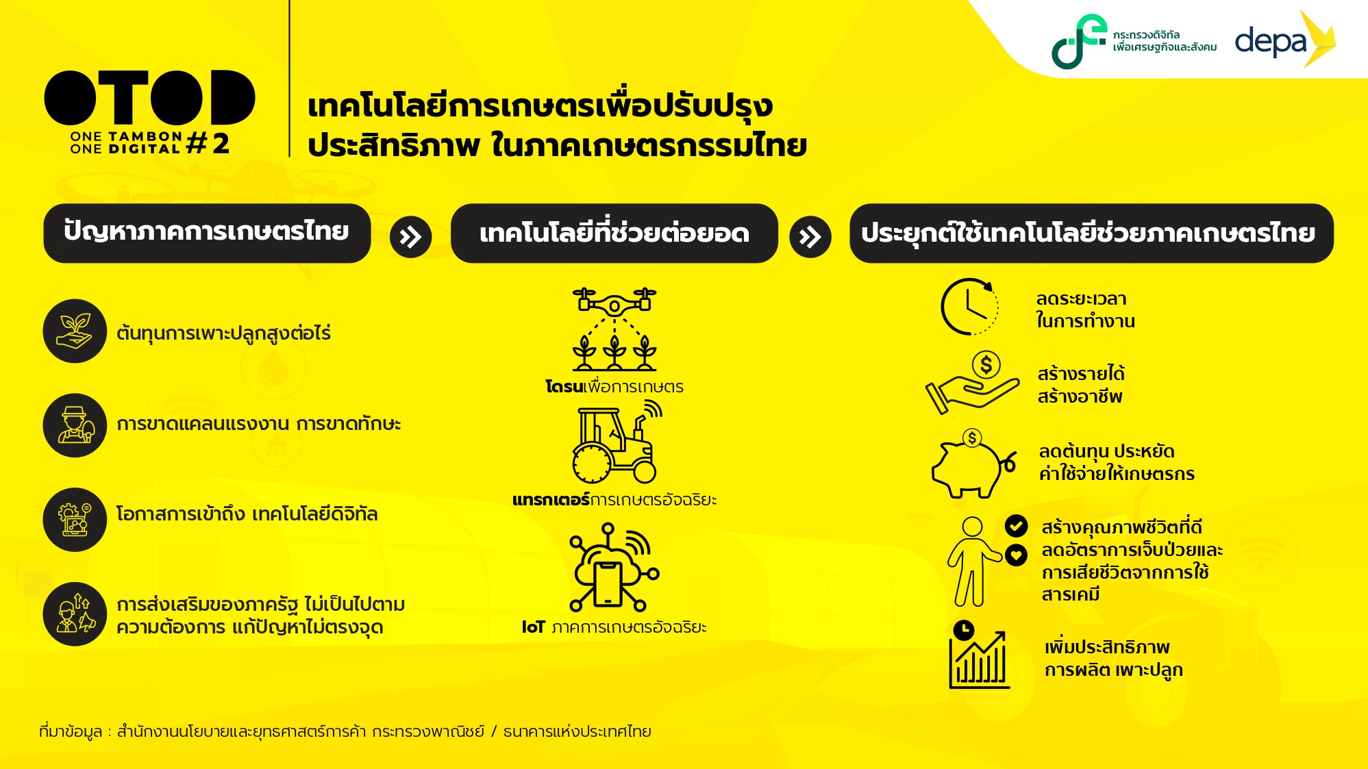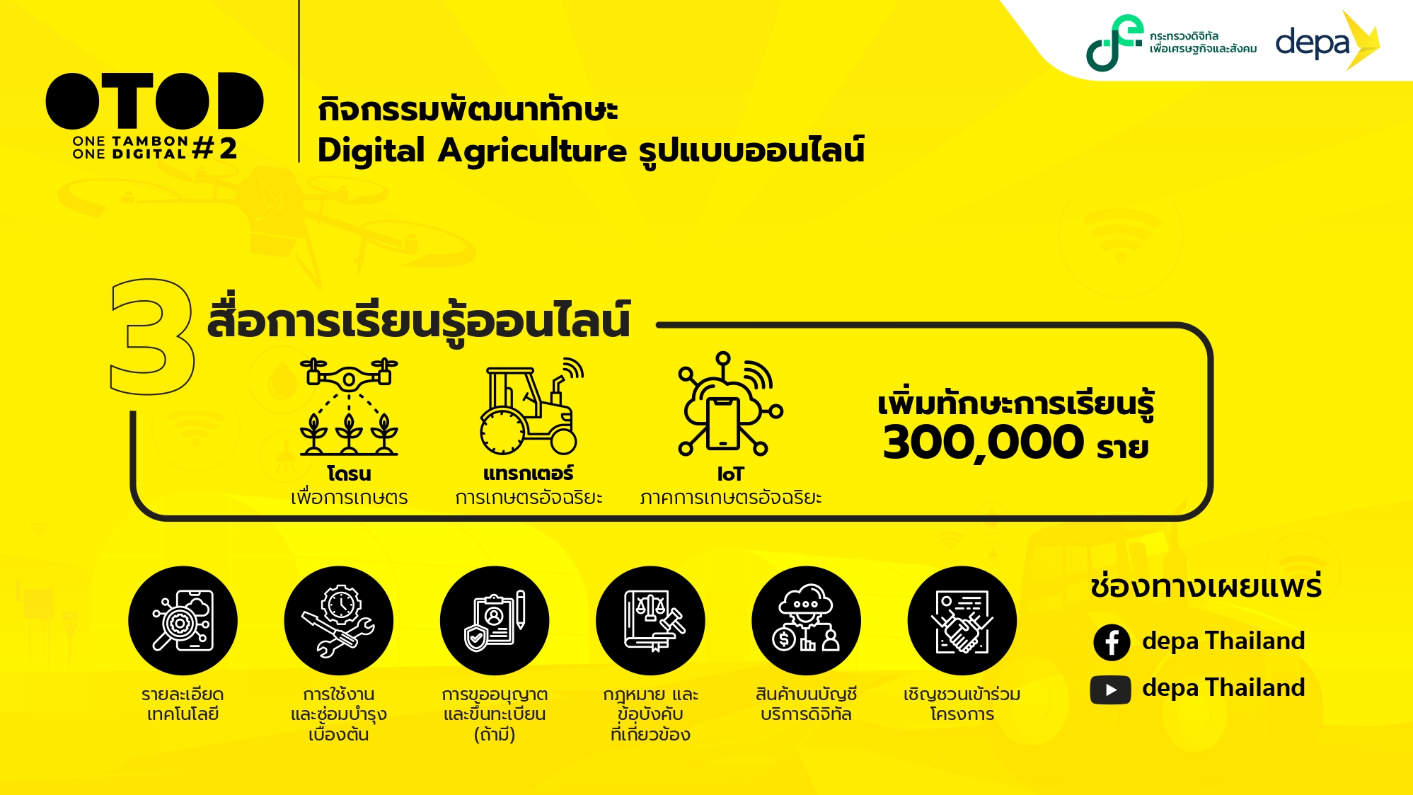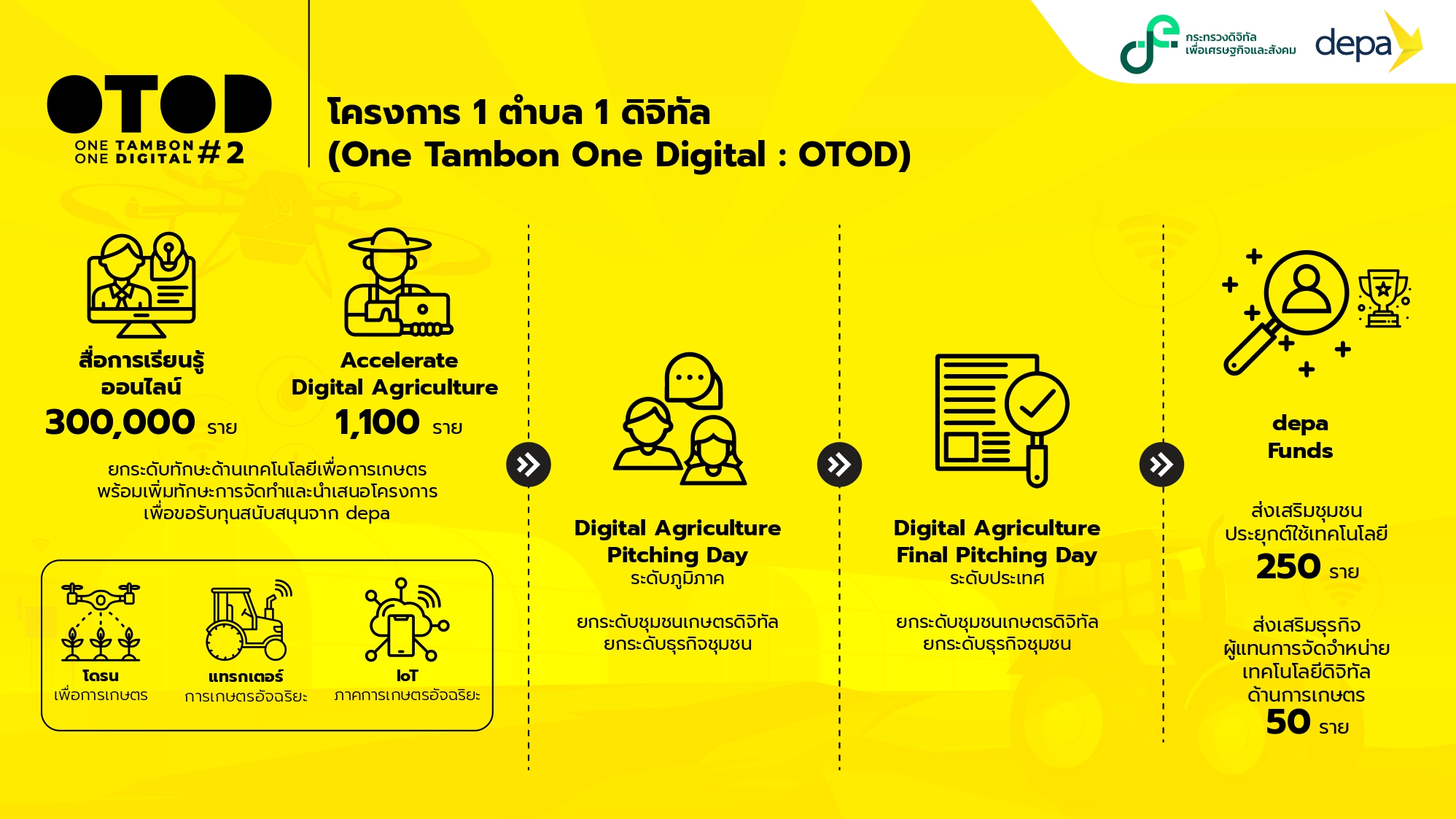 โครงการ 1 ตำบล 1 ดิจิทัล ซีซัน 2 (One Tambon One Digital: OTOD #2) เพื่อส่งเสริมและสนับสนุนให้เกิดการยกระดับทักษะด้าน Digital Agriculture ทั้งรูปแบบออนไลน์ และจัดกิจกรรม Accelerate Digital Agriculture 5 ภูมิภาคทั่วประเทศ รวมถึงส่งเสริมการประยุกต์ใช้บริการดิจิทัลที่เกี่ยวข้องภาคการเกษตร ประกอบด้วย อินเทอร์เน็ตเพื่อสรรพสิ่งการเกษตรอัจฉริยะ โดรนเพื่อการเกษตร และรถแทรกเตอร์อัจฉริยะ จำนวน 350 กลุ่มชุมชน เพื่อให้เกิดการเพิ่มรายได้ ลดต้นทุน ตั้งแต่กระบวนการเพาะปลูก ดูแลรักษาและจัดการผลผลิต ตลอดจนสามารถตัดสินใจที่แม่นยำ พร้อมทั้งสร้างอาชีพ ยกระดับศูนย์ซ่อมบำรุงเทคโนโลยีภาคการเกษตร เริ่มต้นธุรกิจชุมชนใหม่ จำนวน 50 ธุรกิจ ผสานความร่วมกับมือสู่การยกระดับชุมชนเกษตรดิจิทัลอย่างยั่งยืน