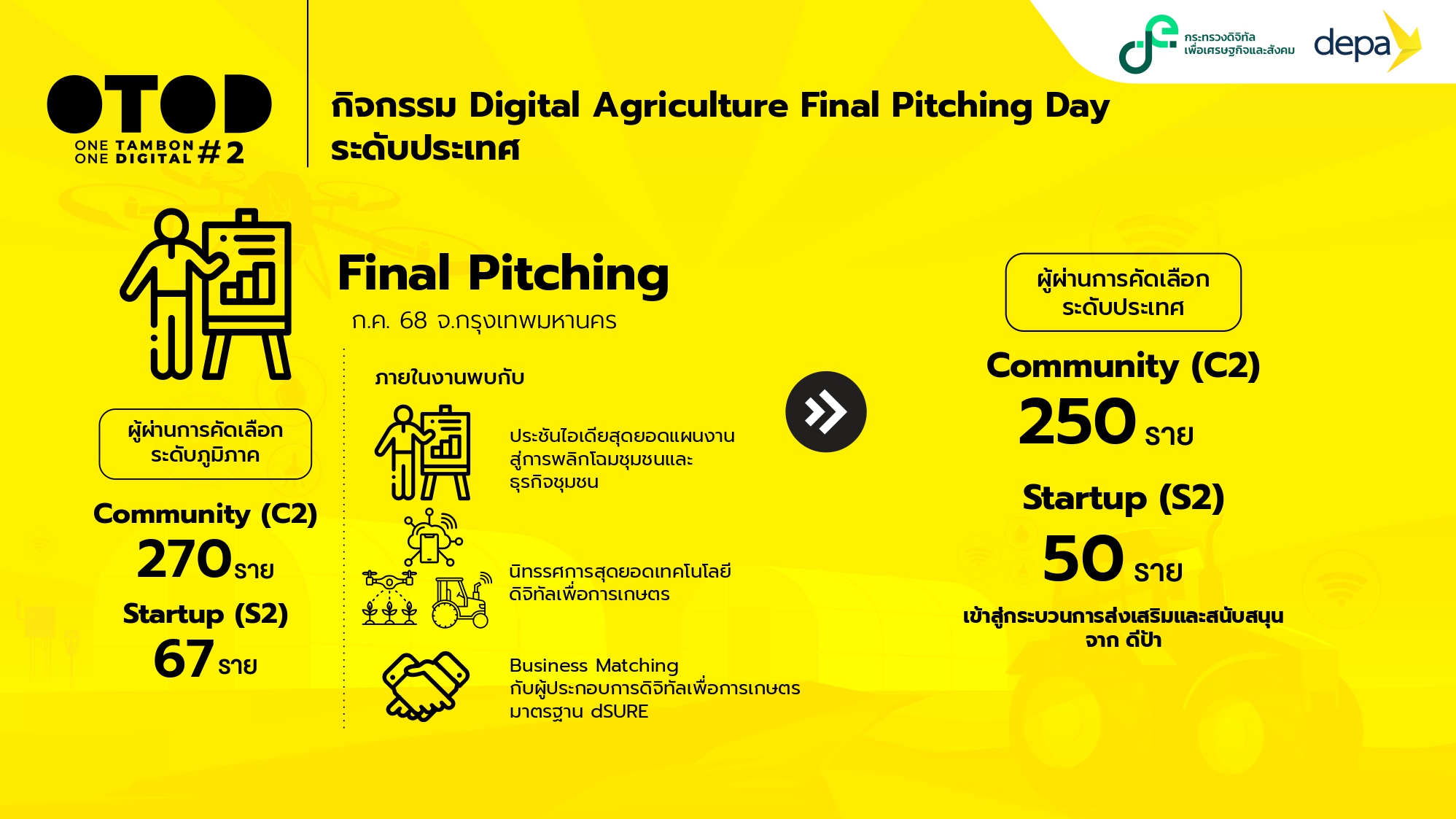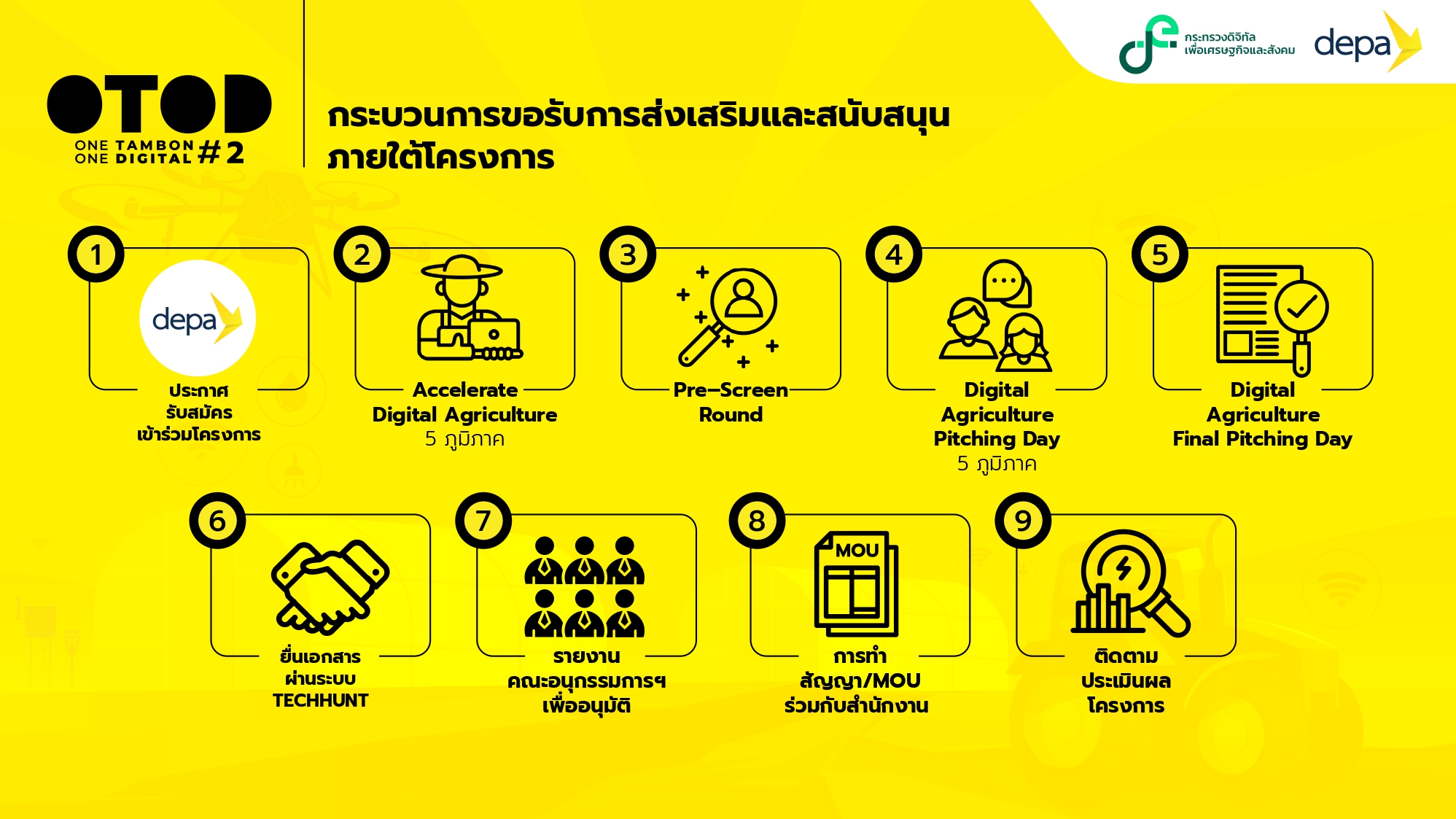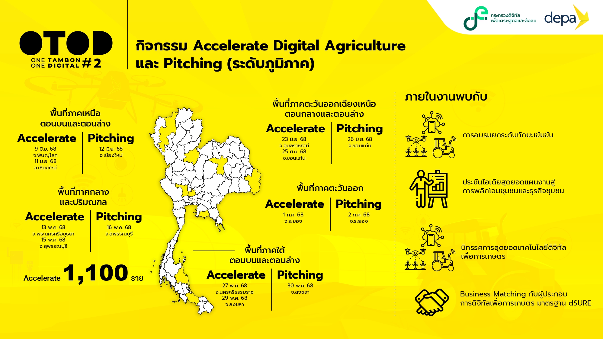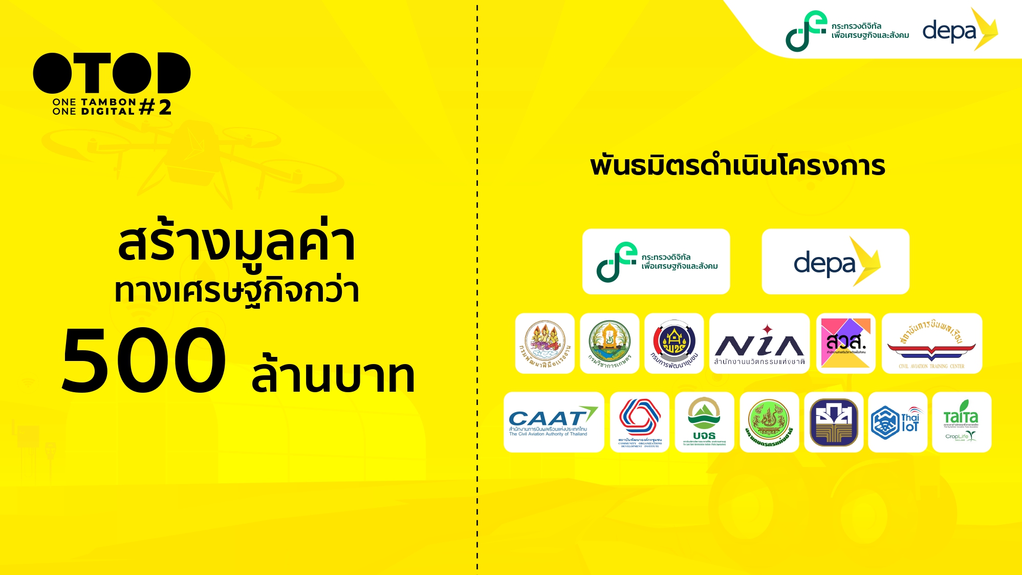 โครงการ 1 ตำบล 1 ดิจิทัล ซีซัน 2 (One Tambon One Digital: OTOD #2) เพื่อส่งเสริมและสนับสนุนให้เกิดการยกระดับทักษะด้าน Digital Agriculture ทั้งรูปแบบออนไลน์ และจัดกิจกรรม Accelerate Digital Agriculture 5 ภูมิภาคทั่วประเทศ รวมถึงส่งเสริมการประยุกต์ใช้บริการดิจิทัลที่เกี่ยวข้องภาคการเกษตร ประกอบด้วย อินเทอร์เน็ตเพื่อสรรพสิ่งการเกษตรอัจฉริยะ โดรนเพื่อการเกษตร และรถแทรกเตอร์อัจฉริยะ จำนวน 350 กลุ่มชุมชน เพื่อให้เกิดการเพิ่มรายได้ ลดต้นทุน ตั้งแต่กระบวนการเพาะปลูก ดูแลรักษาและจัดการผลผลิต ตลอดจนสามารถตัดสินใจที่แม่นยำ พร้อมทั้งสร้างอาชีพ ยกระดับศูนย์ซ่อมบำรุงเทคโนโลยีภาคการเกษตร เริ่มต้นธุรกิจชุมชนใหม่ จำนวน 50 ธุรกิจ ผสานความร่วมกับมือสู่การยกระดับชุมชนเกษตรดิจิทัลอย่างยั่งยืน