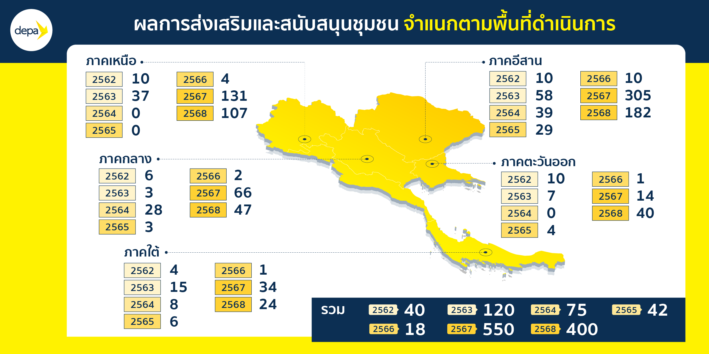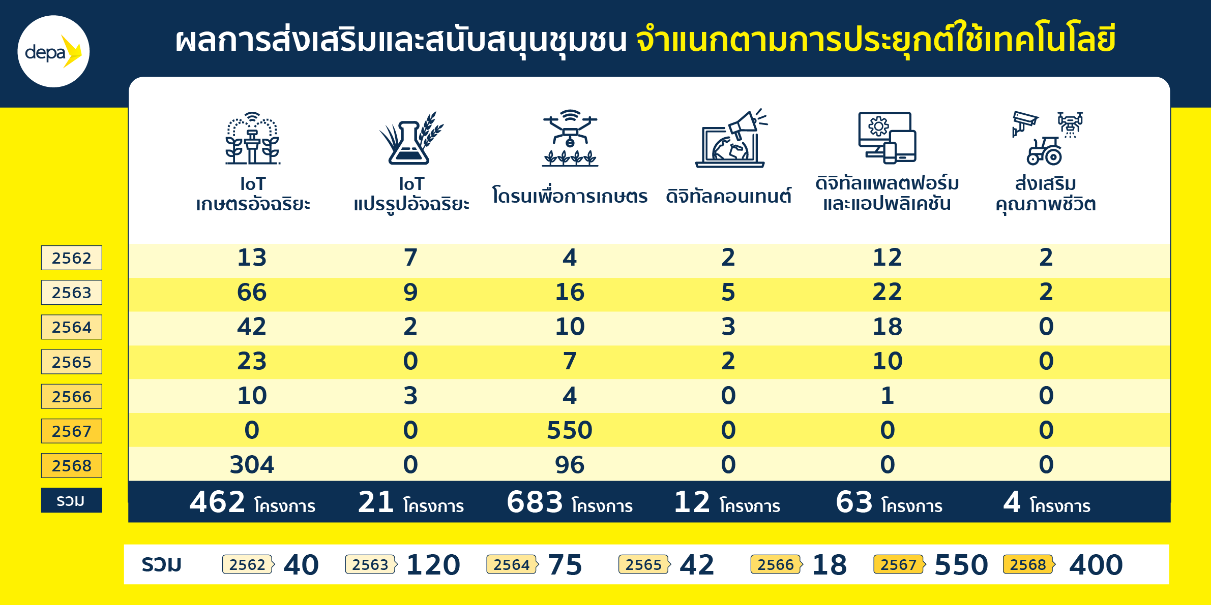 "เดินหน้าภารกิจส่งเสริมยกระดับชุมชนของประเทศ ผนึกกำลังพันธมิตรทั้งหน่วยงานภาครัฐ และ สถาบันการศึกษาทั่วประเทศ ผ่านมาตรการช่วยเหลือหรือการอุดหนุนการประยุกต์ใช้เทคโนโลยีและนวัตกรรมดิจิทัลในชนบท (depa Digital Transformation Fund for Community) สำหรับการประยุกต์ใช้เทคโนโลยีและนวัตกรรมดิจิทัลในระดับชุมชนชนบท ตลอดจนการต่อยอดภูมิปัญญาท้องถิ่นด้วยการประยุกต์เทคโนโลยีและนวัตกรรมดิจิทัลในระดับชุมชนเพื่อการยกระดับคุณภาพชีวิตของชุมชน หรือการประยุกต์ใช้เทคโนโลยีเพื่อการเพิ่มขีดความสามารถและรายได้ของชุมชน มาแล้วกว่า 1,245 ชุมชน "